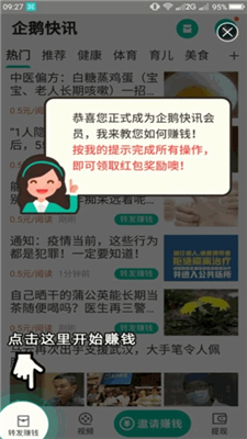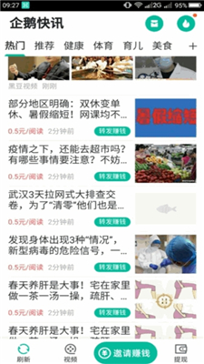 《企鹅快讯阅读赚钱》一款全新上市的新闻资讯阅读、转发赚钱软件,软件上的任务没有任何门槛,只要注册就能领取任务,用户每天坚持在这里转发、阅读文章就能获得稳定的收益,还能通过让好友点击来增加你的收益!