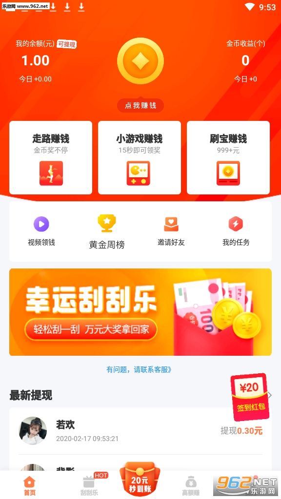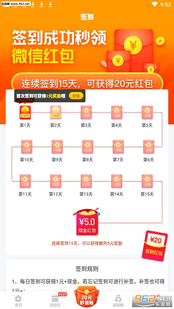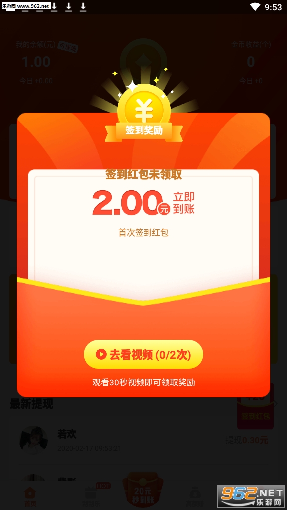 1、初次登录账户都是接到一个1元大红包,大红包立即就会放进账户余额;