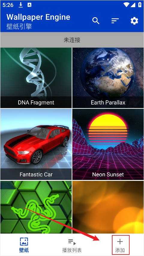 安装并打开《王者荣耀壁纸引擎》后,在界面右下角点击添加”按钮,进入素材管理页面。