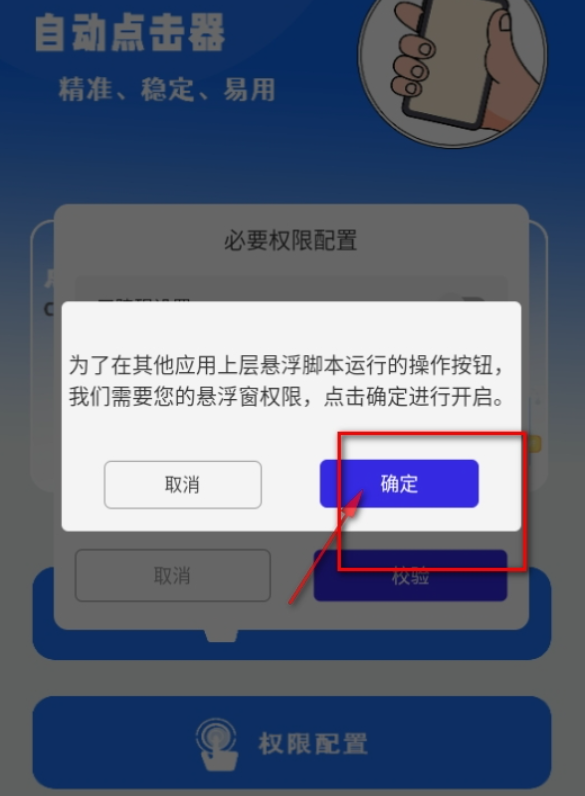 首次使用点击精灵手机版时,点击主界面的开关按钮,系统将提示需要开启悬浮窗权限。点击确定”后,会自动跳转至系统悬浮窗管理页面。