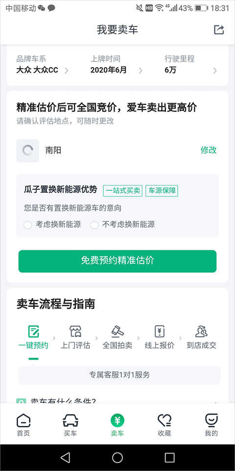 卖车前需完成实名认证(方法同买车流程)。进入【卖车】页面后,选择车型、上牌时间及行驶里程,点击【先估个价】启动评估流程。