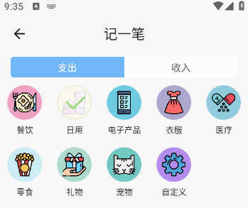 3. 选择收入”或支出”,勾选细分分类(如餐饮、交通、购物等),输入金额并可添加备注;