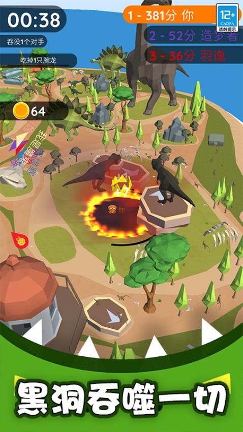1、采用创新的黑洞吞噬玩法,操控黑洞在竞技场吞并物体。体积随吞噬逐渐扩大,吞并大型建筑可获得更高对战积分。