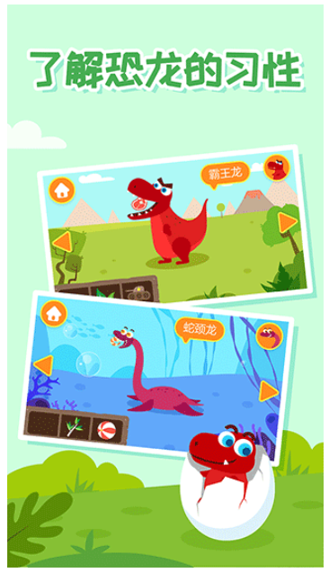 1、提供恐龙培育系统,孩子可以通过日常喂食、陪伴互动等方式,见证恐龙从蛋到成体的成长过程。