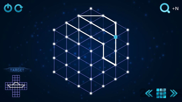 滑动你的手指在绘制线条的多维数据集,直到模式匹配与目标。箭头:旋转立方体。放大镜:得到一个提示。
