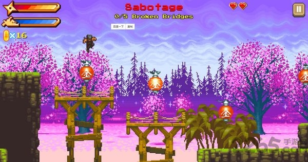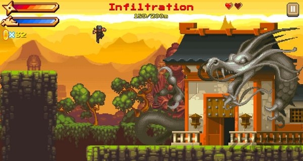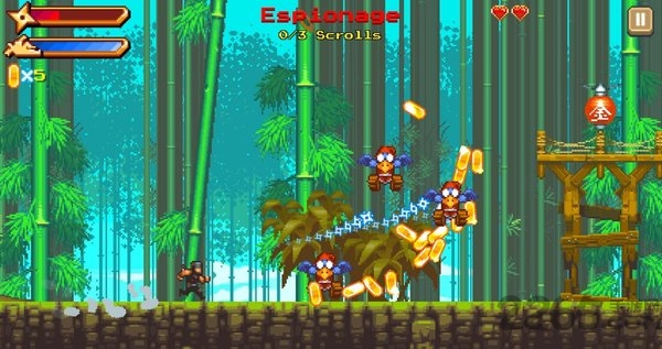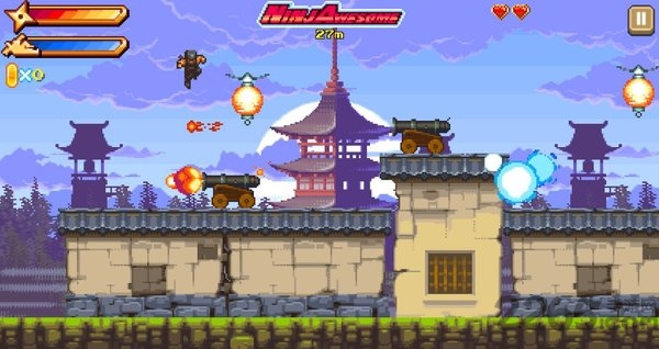 1、玩家控制忍者使用滑行与飞镖等动作跨越障碍消灭敌人。