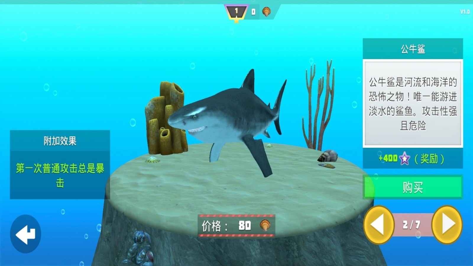 3、支持多种鲨鱼种类选择,不同种类的鲨鱼拥有独特的专属技能与属性倾向,玩家可依喜好搭配发展路线。