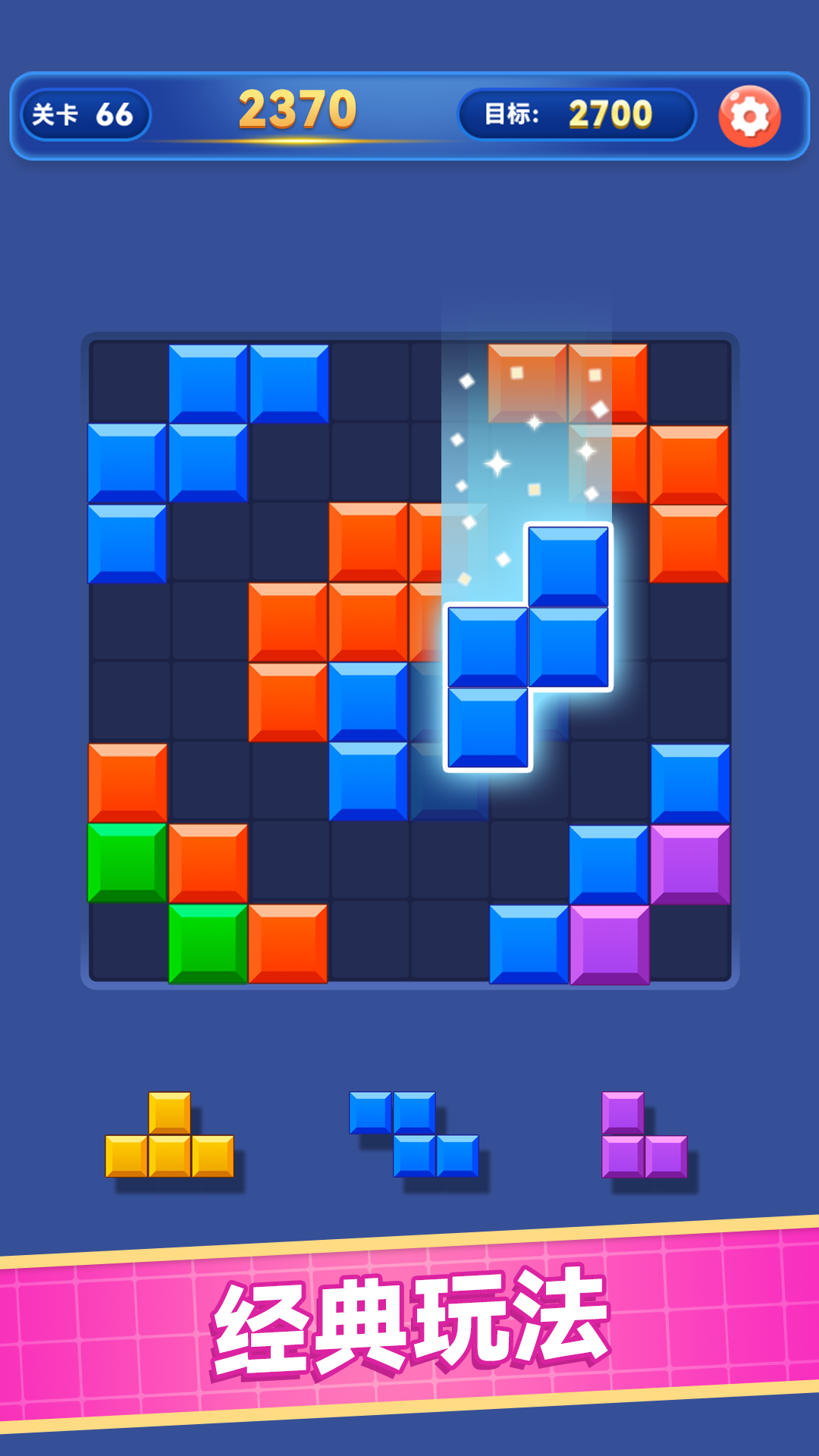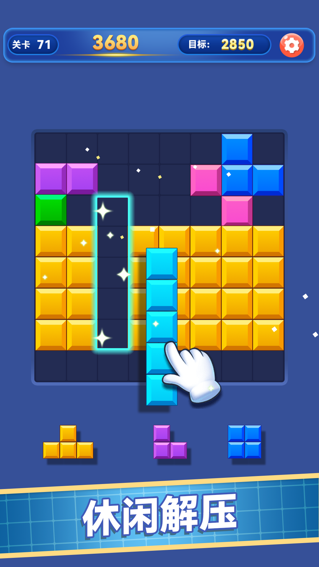 解压消方块本作是款以方块放置与消除为核心的休闲益智游戏。玩家需将不同形状的方块放入网格中,填满整行或整列即可消除。游戏结合简洁的界面、明快的色彩与渐进式的难度设计,为玩家带来兼具放松感与策略乐趣的消除体验。