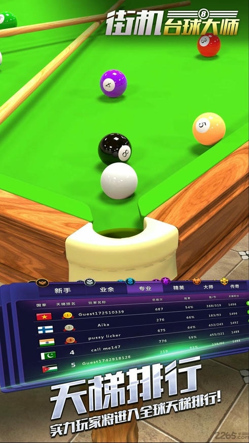 挑战网络上来自全世界的朋友在3D台球世界对战,从草根轻松成长为台球明星。