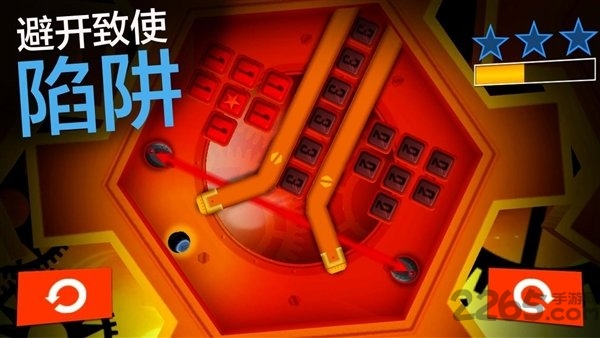 每一关中有三个标有金星的红色按钮,如果你想三星通关,就得在右上角的读条结束前,以最快的速度触碰完三个金星按钮。随着游戏的深入,阻碍Nano的障碍种类也会越来越多,不过若能善加利用,也会有助于闯关哦!