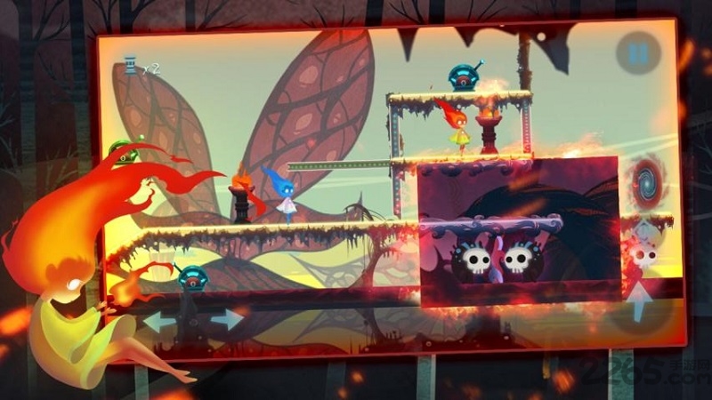 当然游戏不会这么简单,这是因为火炬并不只存在于表面,所以主角得使用她那回溯过去的能力,将在过去时间中所存在的火炬也点亮了,才能真正地完成一关。然而关于过去地点的显示只有屏幕中的一小格,玩家需要拖动这个小格子才能够完好地看到不同于现在的关卡设计。