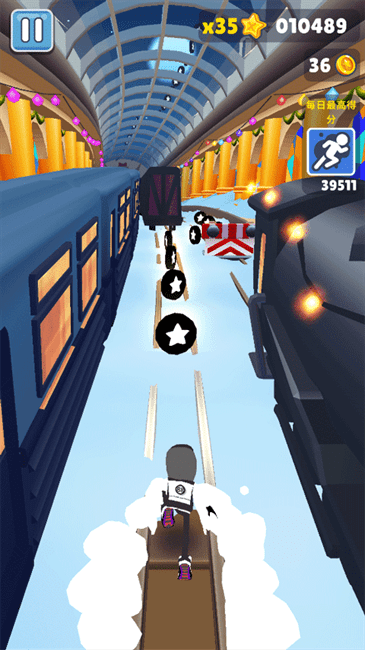有地铁也会有隧道,中间有一根柱子,左右两边无规律会有火车奔过来,这个时候就要考验玩家的应变能力。在前期的时候过个隧道表示毫无压力,后期30W分过后经常有玩家出现手指反应不及时然后被撞死的现象。对于过隧道的技巧,眼疾手快是前提,关键是心态要放平静,这样才不会手滑。