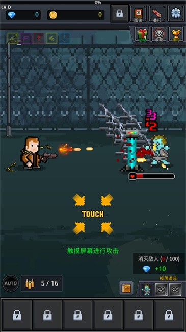 以传统的僵尸题材为背景,采用经典的像素画风打造,玩家只需要通过在点击射杀在防线以外的僵尸即可,但期间随着僵尸的改造,其蕴含的金币也愈来愈多。同时等级的提升武器的也会随着解锁,丰富多样的武器、僵尸和皮肤图鉴收集解锁,高度自由的技能加点,便捷简单的点击射击操作,辅以轻度休闲的武器佩戴、属性提升和僵尸自由升级改造玩法。