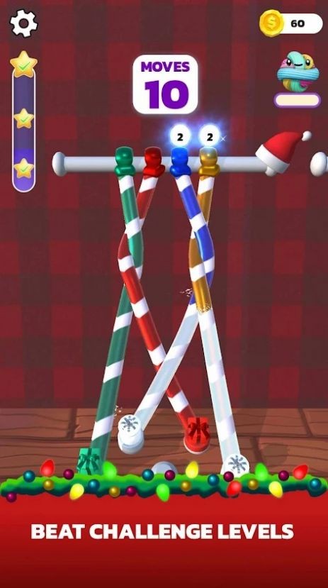 重重的的游戏关卡,完成各项精彩挑战,关卡会越来越难,绳子复杂程度升级,极具挑战性;