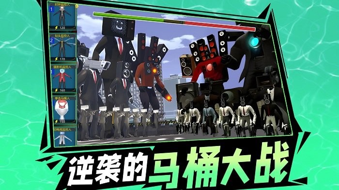 逆袭的马桶大战游戏是很经典的动作对决游戏,更是风靡全球的马桶人主题游戏,我们玩家点击进入游戏后将在这个世界里面领导马桶人军队,与其监控人进行对决,夺回属于马桶人的自由,战胜监控人的统治吧!过程热血刺激,精彩无限,望君喜欢!