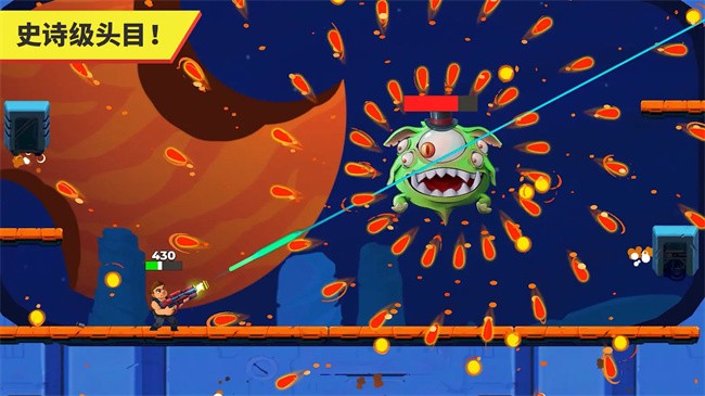 在这里你将通过使用各种武器,消灭外星人,注意躲避外星人的子弹,通过射杀更多的对手,来获得更多强力的装备,以让自己的综合实力更高。那么关于该游戏的具体操作其实非常简单,左侧的虚拟摇杆控制角色移动,右侧的跳跃按钮可以配合前方的移动来进行子弹的躲避和平台的跳跃!