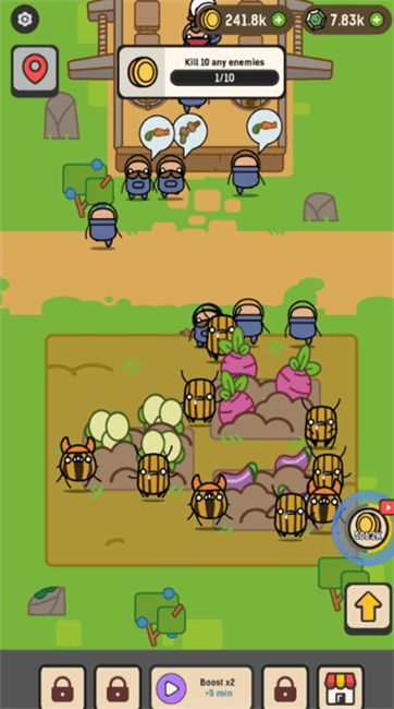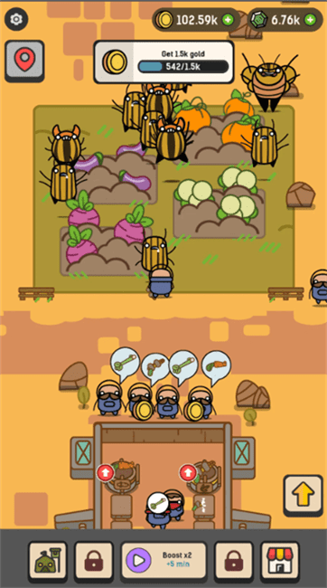 即使离线也能继续战斗。即使您睡觉或忙于自己的事,您的农民也会不断驱赶虫子,并为您获取资源。