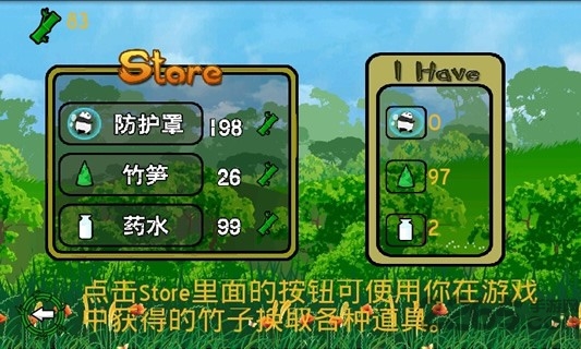 当你遇到障碍物的时候,你可以点击右下角的竹笋进行攻击。但是你要注意上方的各种道具的数量,如果道具不足,你将任何事情都做不了。道具没有了没关系,尽量在游戏中收集更多的竹子吧。然后点击购物篮图标,去游戏商城换取各种道具。