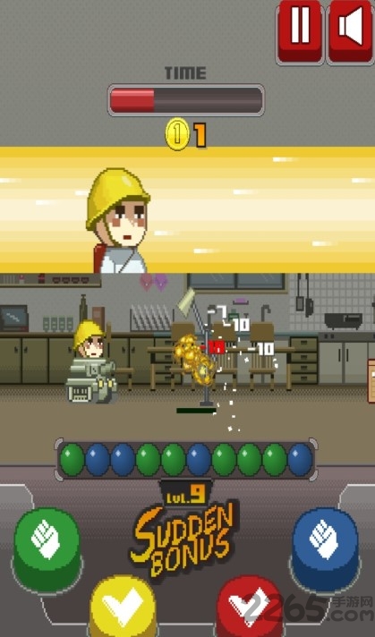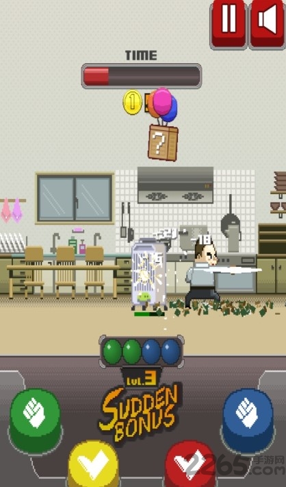 游戏的操作方式很有意思,屏幕下方有4个不同颜色的攻击按钮,而正中间的那个小小的类似于红绿灯的东西,就是告诉我们应该按那些颜色攻击按钮的提示区域。例如:中间显示的是蓝绿,那么我们只要按照提示依次按下蓝色的拳头按钮和绿色的拳头按钮,就可以快速破坏当前目标,而不用依赖初期比较低的攻击力去一下下慢慢磨血。这是游戏的核心系统,也就是让玩家按照提示来迅速而正确地进行按键操作。