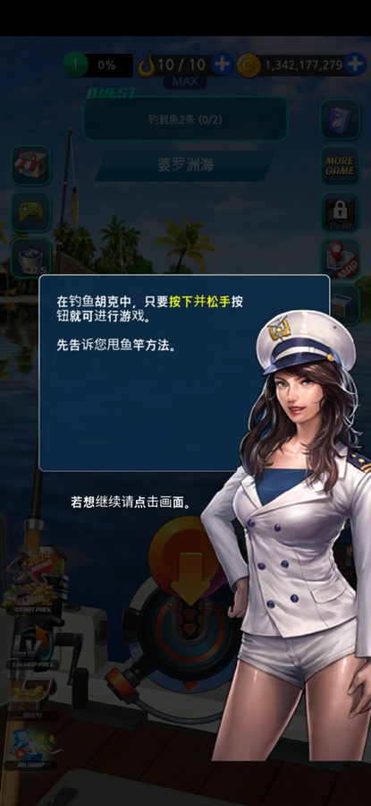 在游戏开始时会对玩家进行详尽的新手教学,玩家只需下拉场景中央的蓝色按钮,即可进行放线操作静待鱼儿上钩。鱼儿上钩后,玩家需要在三秒内进行收线,且不能触及弹力条。玩家可将钓上来的鱼进行放生或售卖,通过得到的金币进行钓具的更新。