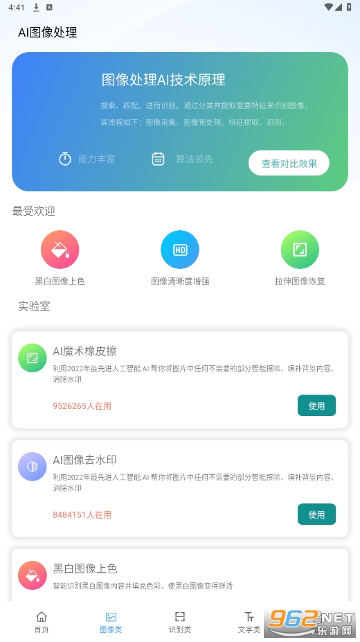 3、图像类:去水印、橡皮擦、黑白图上色、无损放大、雾化、色彩增强、人像动漫化等14个,全部都是AI智能工具。