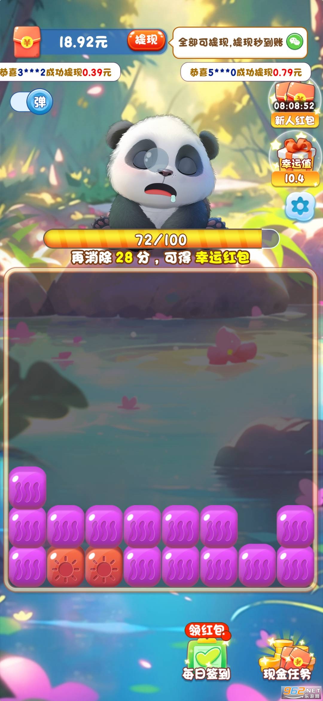 《熊猫滚滚乐》是一款趣味消除游戏,核心玩法是消除同色方块赢取红包,关卡越深,挑战越大。巧妙运用策略,累积积分,更有惊喜奖励随机掉落。集中消除更多方块,获取更高分数和丰厚奖励。轻松休闲,又能锻炼脑力,快来体验消除乐趣,赢取红包吧!