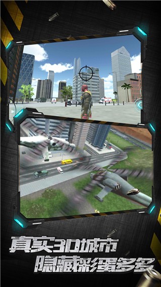 1、一个非常大的城市,玩家需要装备自己来保护城市,购买不同难度的枪支来射击和保护城市的和平。