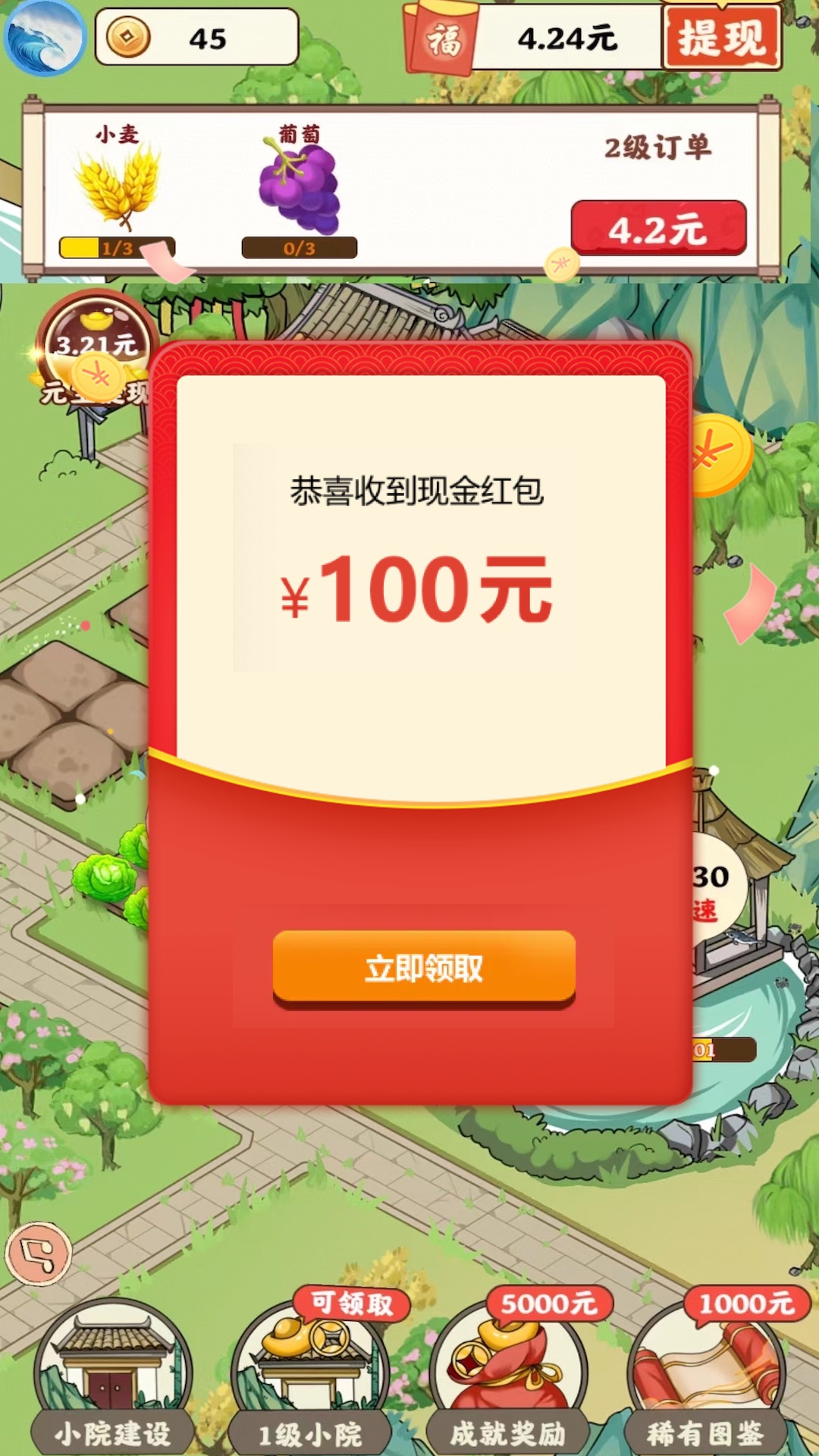 《青青庭院》是一款种田类红包小游戏,操作界面直观易懂,玩法丰富多样。玩家在游戏中可扮演农场主,自由种植各类蔬菜、水果等作物,享受播种与收获的乐趣。还能开垦荒地,种植不同农作物制作食物赚钱,等级越高兑换比例越高,有空时玩一玩,没空也能领取0.3元红包。
