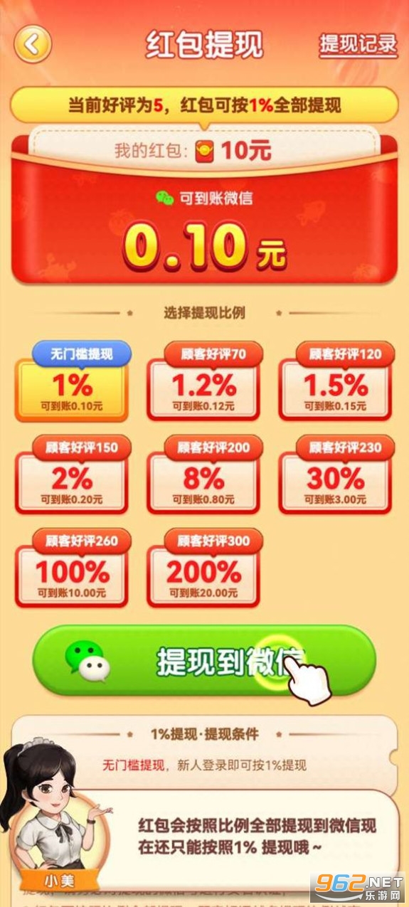 但是不要想太多了,比如你看到我下面这张图发出来显示有10元红包,实际上只能按照1%比例提现,简单的说就是我的10元红包提现后只会到账1毛钱;游戏好评度越高,可提现比例也越高,到了提升8%刷新比例的时候,会有其它升级条件,想要提高兑换红包比例也不简单。