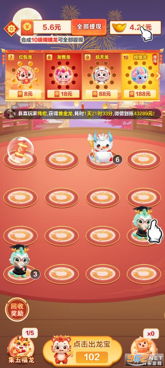 2.在龙年吉祥游戏中集齐5福龙可赚8888元,游戏中已经提示有3万多个玩家成功集齐了,8888元还需要解锁30级龙才可以提现。