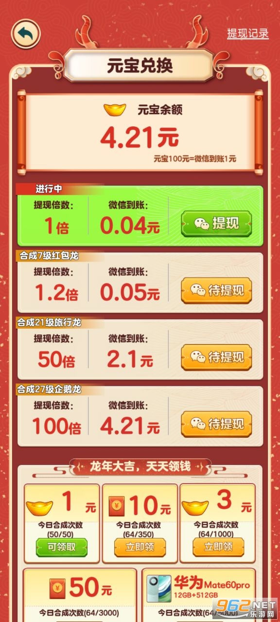 《龙年吉祥》是一款以春节年俗为背景的合成养成类手游,玩家通过合成龙兽获取红包奖励。游戏融入五福收集、年兽挑战等传统元素,宣称提供登录红包、提现奖励等福利机制,主打休闲娱乐与小额收益结合的轻量化体验。