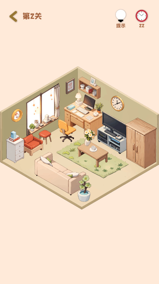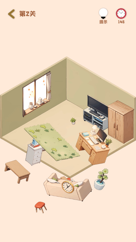 游戏中不仅仅是简单的家具摆放,还需要玩家合理规划空间,进行物品收纳。玩家需要将一些小型家具和装饰品放在适当的位置,使房间看起来整洁有序。