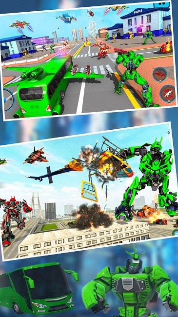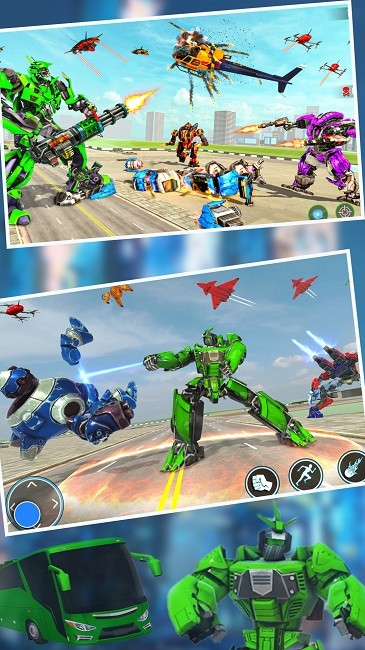变形机器人巴士是一个玩法多样的机器人对决游戏,在城市中和不同的敌人对战,炫酷科幻的对战场景,享受PK的激情,格斗控制都采用虚拟按键的方式,灵活的控制才能打出更多的伤害。在动感的背景音乐中完成一系列任务,让人有一个舒适的视觉的效果体验。玩家可以在这里解锁新型军车机器人和飞行汽车机器人