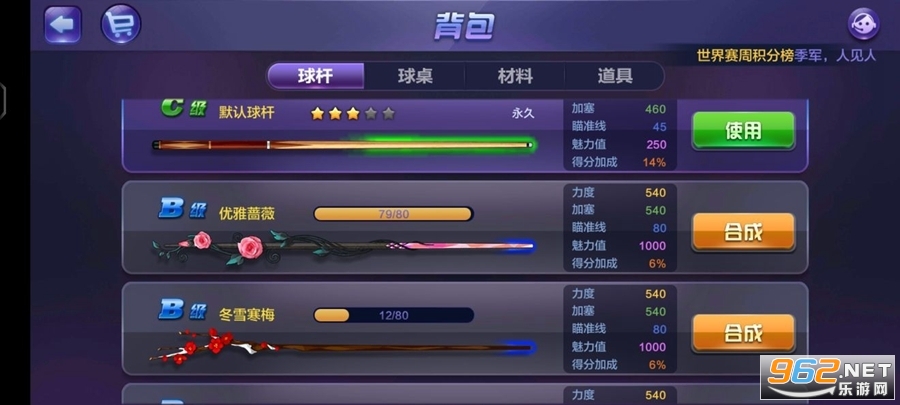 尖端巧粉,杆杆随心,游戏中配置多种属性、不同品质外形的球杆和球桌,超炫球技,彰显至尊身份。