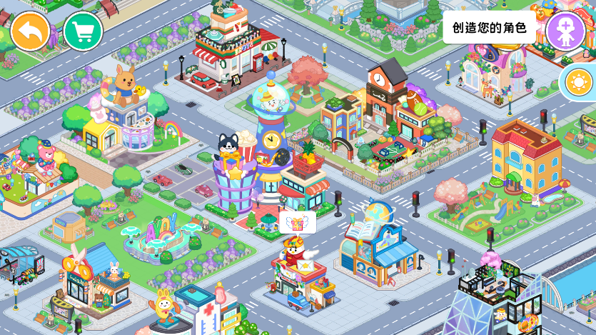 2、丰富的游戏世界中,展现可爱的卡通人物和各种建筑物,自由探索。