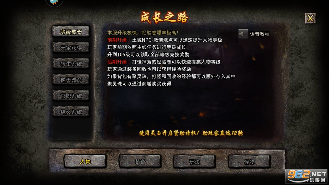 在游戏初期我们可以跟任务一起升级,因为它会给你两本技能书,泡点能提升到50级,在初期别买太多了,打大米赞助【武林至尊】即可,赞助装备回收又提高了50%,直接送料四转,可谓出门就是四转;快进【冰雪之城】、打出装备、拾取元宝
