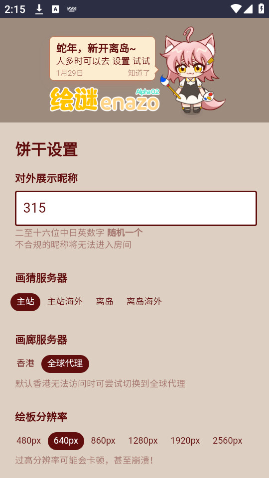 《绘谜enazo》是一款结合绘画与解谜元素的创意互动应用程序,旨在为用户提供独特的艺术体验和脑力挑战。玩家可以在这个平台上绘制和猜测动画、游戏、主题等内容,涵盖了广泛的题材和兴趣点。用户无需登录即可开始游戏,可以直接加入别人的房间或创建私密房间与好友一起玩。支持自由创作和谜题设计,激发用户的创造力。