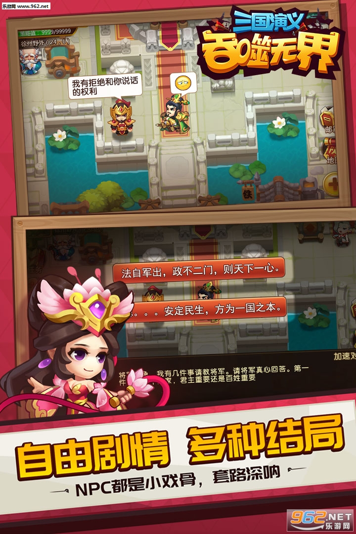 FC吞食系列单机跑图RPG玩法;正野史剧情、吐槽式对白,对战新演义;多重挑战、抽将特权,网游土豪般的体验!