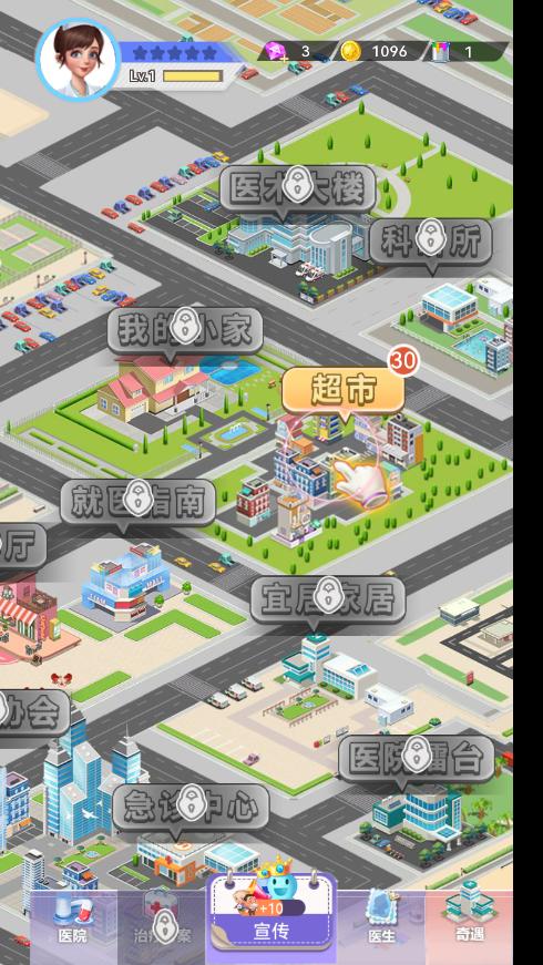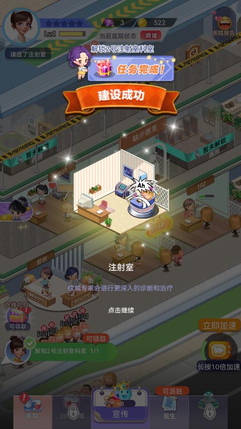 打开院长模拟器,过完教程后,右边会出现医院装修的图标