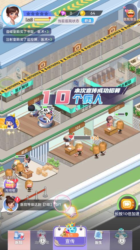 医院建设,自由定制:从简陋的小诊所到宏伟的奇幻医院,一切由你打造。你可以自由设计医院布局,升级医疗设备,招募特色医护团队,打造一个既高效又充满个性的医疗帝国。