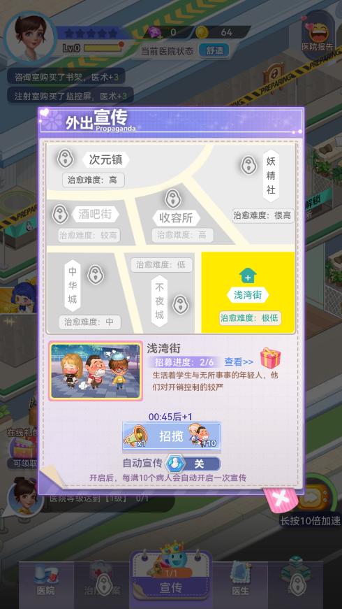随着医院水平的提高,越来越多的地区的患者都愿意来到你的医院就诊,你可以在满足条件后,前往这些地区招募病人,利用医院的名气,多多招募这些病人吧,你会得到丰厚的报酬。