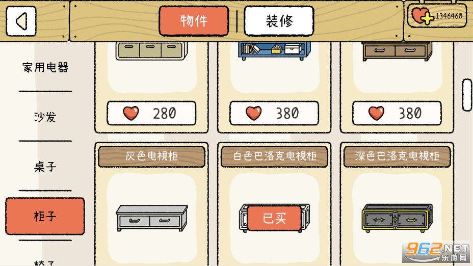 3、超多的家具和时装道具等你用红色爱心购买,让这些物品有秩序的摆放。