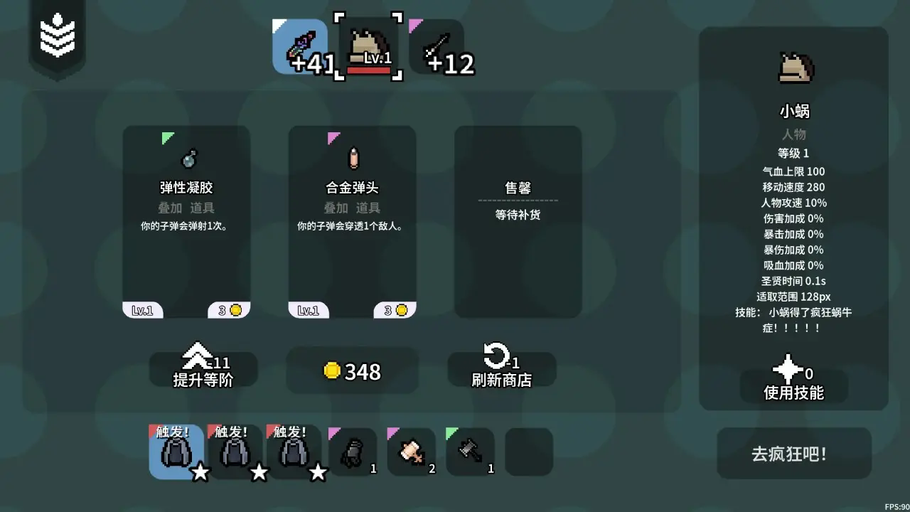 《疯狂蜗牛症》不仅是一款简单的冒险游戏,它融合了类幸存者和战旗酒馆的元素,为玩家带来了全新的游戏体验。在游戏中,玩家需要不断寻找资源、强化自身,以应对越来越强大的敌人。同时,游戏中的商店特效为玩家提供了多种强化手段,让玩家在挑战中不断成长。
