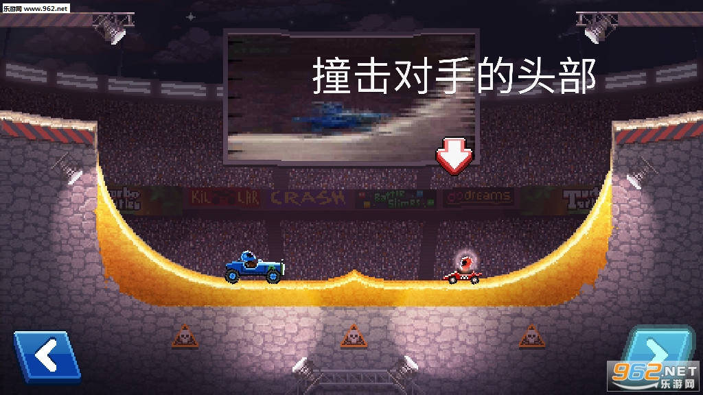游戏采用了2D横版的挑战模式,玩家们将进入一个封闭的赛场之中,驾驶自己的赛车撞向对手,谁先撞到对手的头部即获得胜利。游戏更像是游乐±锩娴呐雠龀档母芯酰龌娴男Ч袼乜帕8谢故潜冉涎现氐模婕颐堑某盗境苏娴腇1赛车以外,更是有货车、拖拉机、铲车、中巴车等等各种类型的样式,碰撞过程也是动作不断,非常夸张的搞笑趣味。