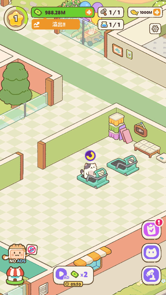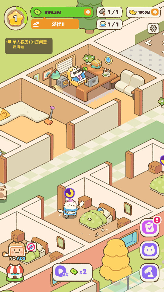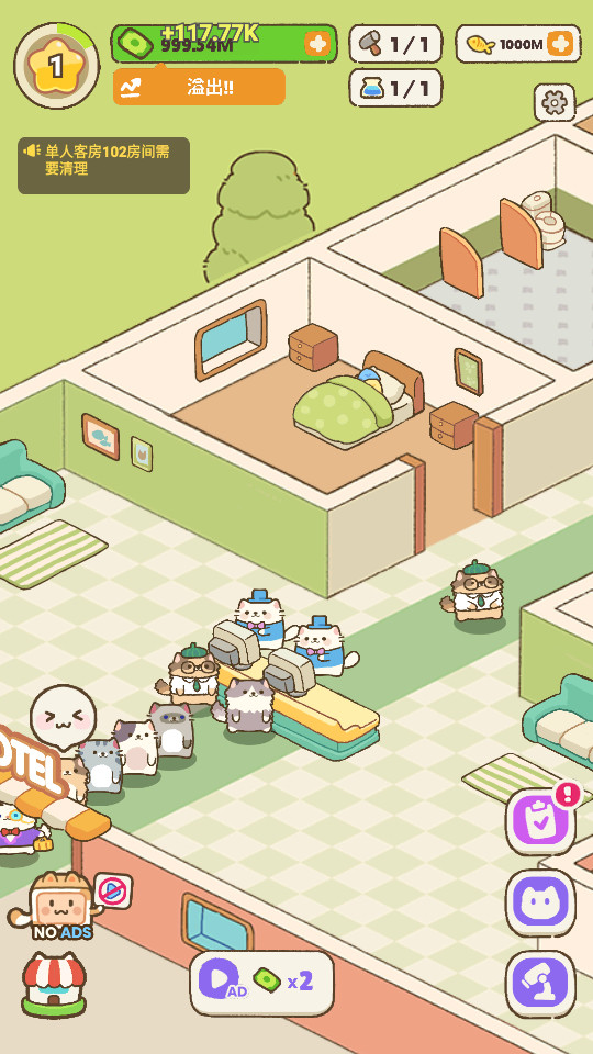 1、建造和装饰你的猫酒店,包括客房、餐厅、游乐区等设施,吸引更多的猫咪入住;
