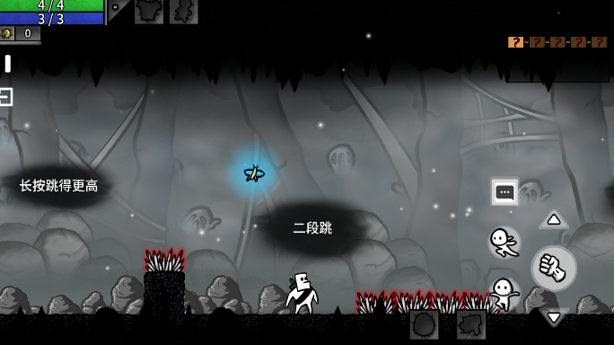 第三个钉刺需要完成二段跳,才能过关哦,还是跳跃加冲刺一起长按