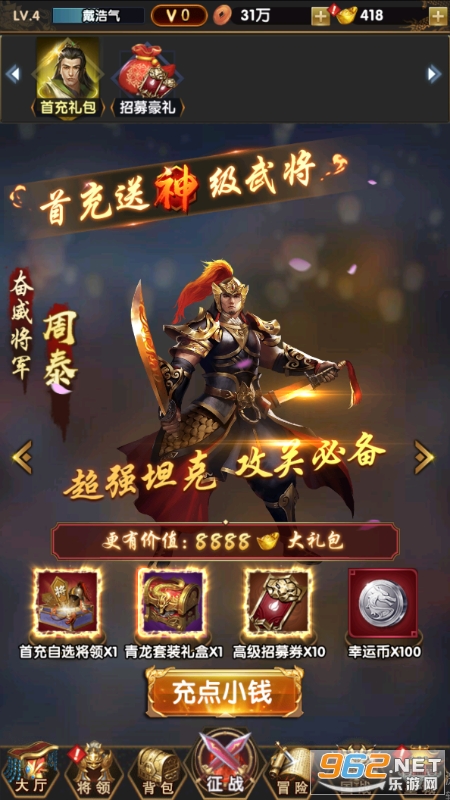 《富甲萌国(三国争霸0.1折)》重回三国,全新0.1折三国卡牌来袭,超爽充值比例0.1折,每日上线签到即可领取五星英雄和橙色装备还有海量升阶材料,连续登录7天技能领取国色大桥,挑战首领即可领取龙胆赵云和极品红装还有各种极品道具等你拿,超爽福利,无需爆肝,登顶称霸,指日可待,就等你了主公