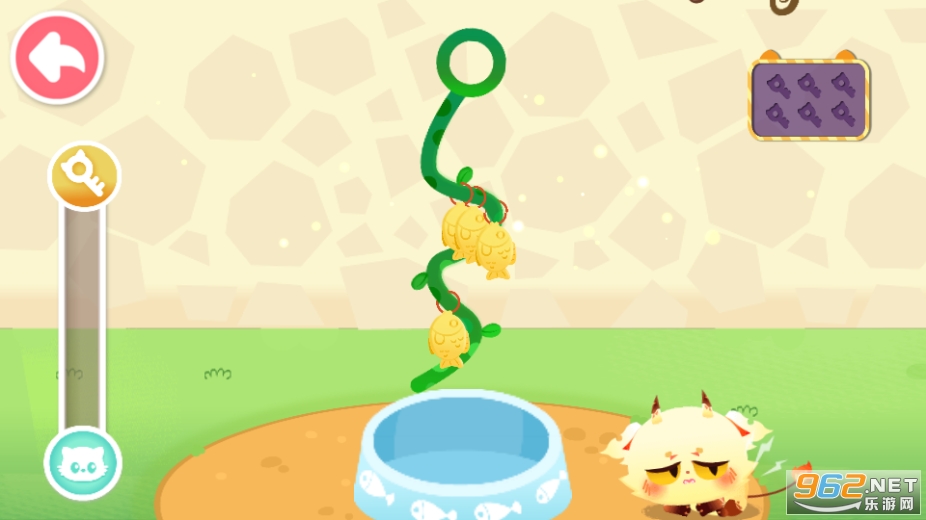 还有一个毛线球在哪儿?它被多根吊绳缠住,吊在了高处!剪断一根吊绳,再剪一根……呀,被吊住的毛线球不停晃动,该何时剪断,才能让毛线球被小猫顺利接住?宝宝快动动脑筋!