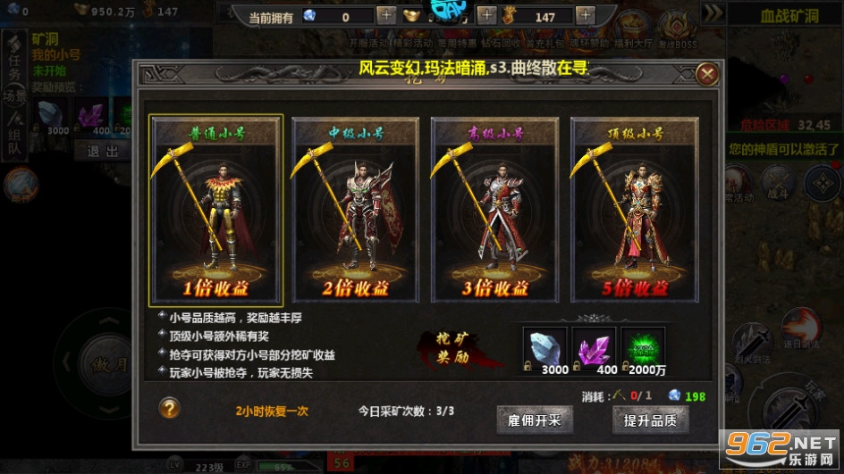1、职业建议:如果是大R玩家的话建议玩战士,前期没装备战士会显得比较地辛苦一点,装备起来之后一般同级别装备的基本是没法还手的。小R的话就可以建议选法师、道士了,法师打架猛但是没有道士打装备来得快,高血怪物没有毒的话回血速度会很快。