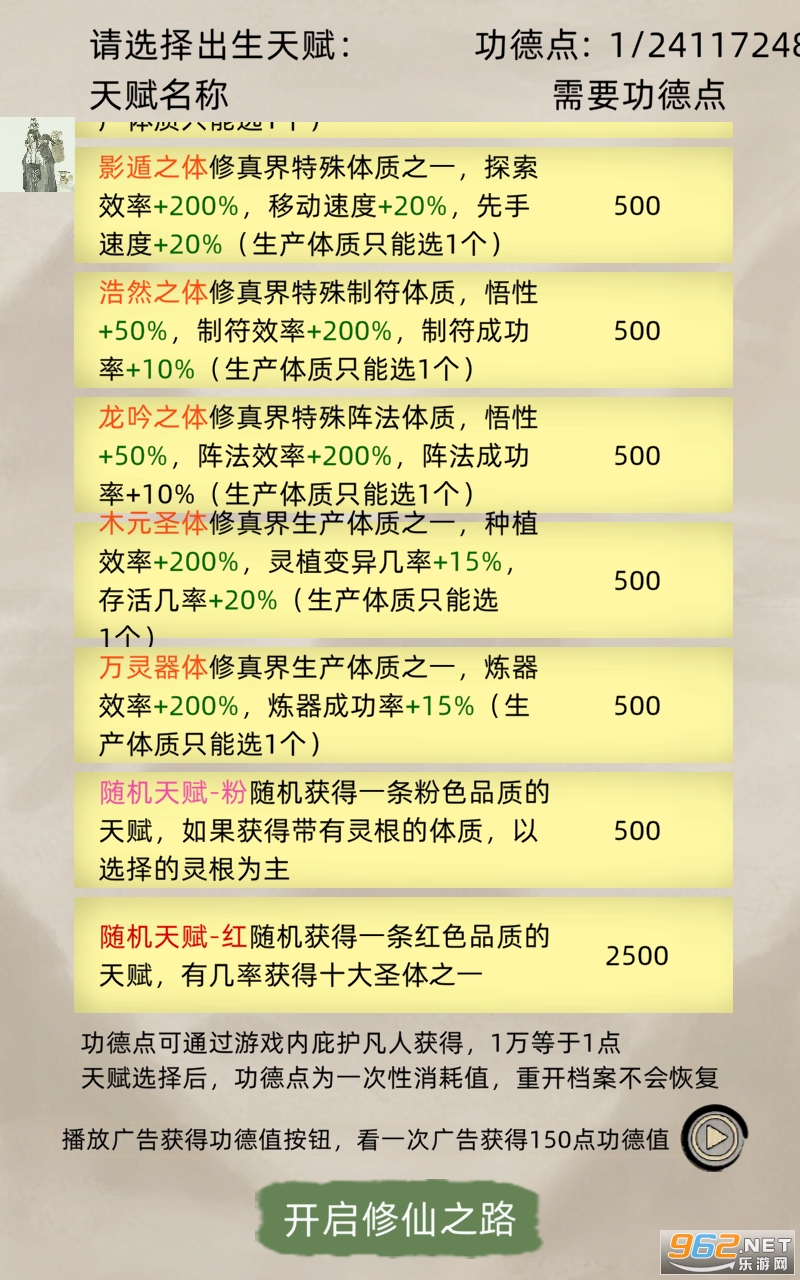 2、天赋选500的剑修+500的修炼道体+300天灵根+100悟性非凡+15的长寿(血脉选人皇,人皇会给很多修炼和悟性都高的后代,成长贼快,不需要等炼丹师炼丹)。